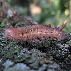 Назва «червонохвіст» пов'язана з яскравим «хвостиком» гусені - пучком малиново-червоних волосків на кінці тіла— справжній "панк" світу комах. Друга назва метелика — вовнянка сором’язлива — походить від пози, яку він приймає під час відпочинку. Метелик витягує свої передні волохаті лапки далеко вперед, наче "сором'язливо" ховаючи під ними голову Це нічний метелик з родини Erebidae, який часто привертає увагу своєю незвичною зовнішністю. Хоча гусениця виглядає привабливо, її волоски можуть викликати подразнення шкіри (кропив’янку) у чутливих людей. Краще спостерігати за нею, не торкаючись руками. Коли гусениця відчуває небезпеку, вона згортається в кільце, демонструючи чорні проміжки між сегментами тіла та свій яскравий червоний "хвіст" - це слугує попередженням для птахів про те, що вона може бути несмачною або небезпечною. Незважаючи на дещо "грізну" назву, цей вид є частиною екосистеми наших лісів і садів. Гусениці поичнають живлення у другій половині літа і до опадання листяєнебезпечним шкідником багатьох листяних порід, дуба, граба, бука, берези, в'яза.Зимує у вигляді лялечки в коконі в лісовій підстилці.